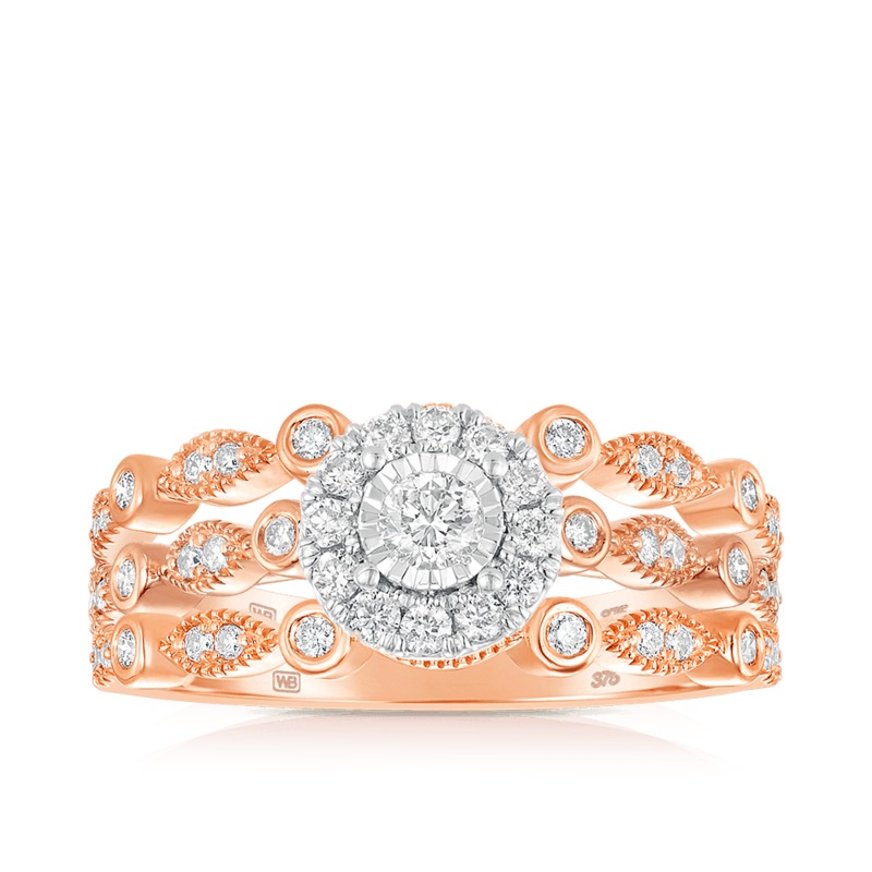0.50ct TW Diamond Halo Engagement & Bridal Set Rings in 9ct Rose Gold