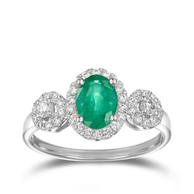 Be the first to review “0.98ct TGW Oval-Cut Emerald & Round Brilliant Diamond Halo Three Stone Ring in 18ct White Gold”