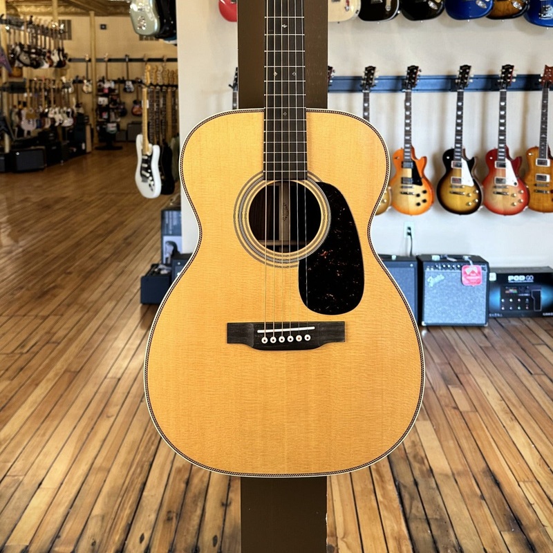 Natural, 00-14 Fret body shape, Solid Sitka Spruce top, Scalloped X bracing, Multi-stripe Rosette, East Indian Rosewood back and sides,Antique White binding with the Bold Herringbone top and multi-stripe back inlay, Style 28 back purfling, Ebony fingerboard with the Abalone long pattern Diamond and Squares position markers on a modified low oval w/high performance taper shaped select hardwood neck, 24.9 scale length, 1 3/4 nut width, With hardshell case