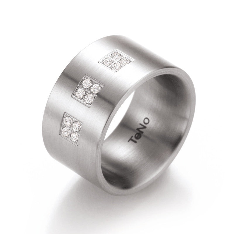 TeNo Stainless Steel Ring, Wide with 3 squares of 4 diamonds in each square, 0.24ct. Total Weight.