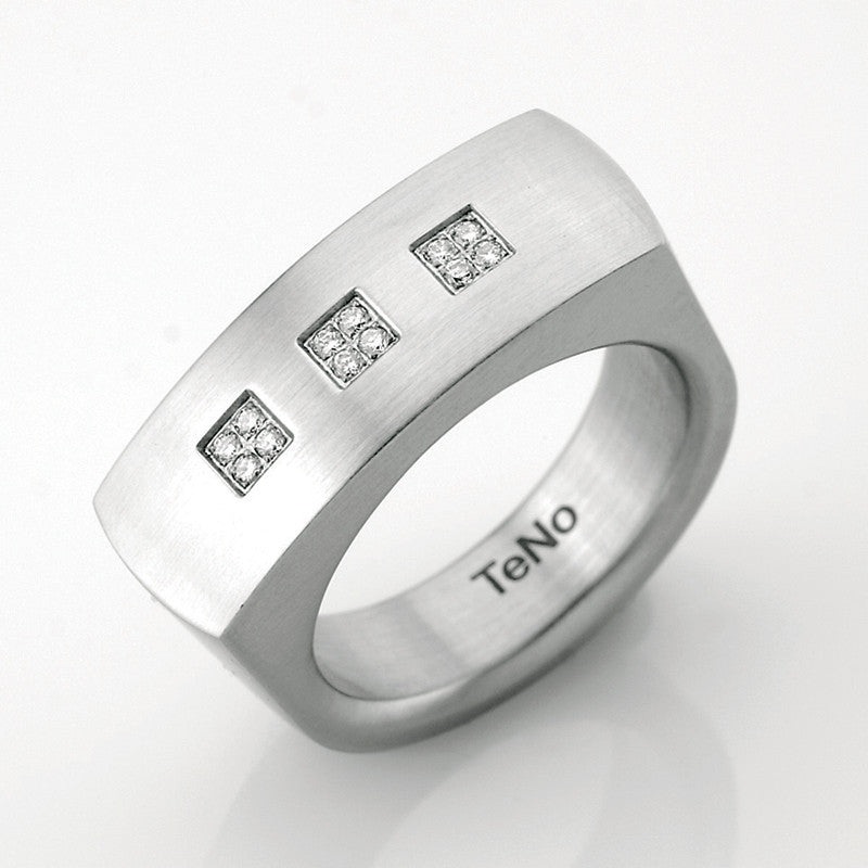 Discontinued item. Final Sale!SiRa steel ring w/ 12 .008 carat white diamonds set in 3 squares Total weight of .096 carats.Front Ring Width: 7 mm Back Ring Width: 5 mm Front Ring Thickness: 4.5 mm Back Ring Thickness: 2.5 mmTeNo jewelry is made of the fine
