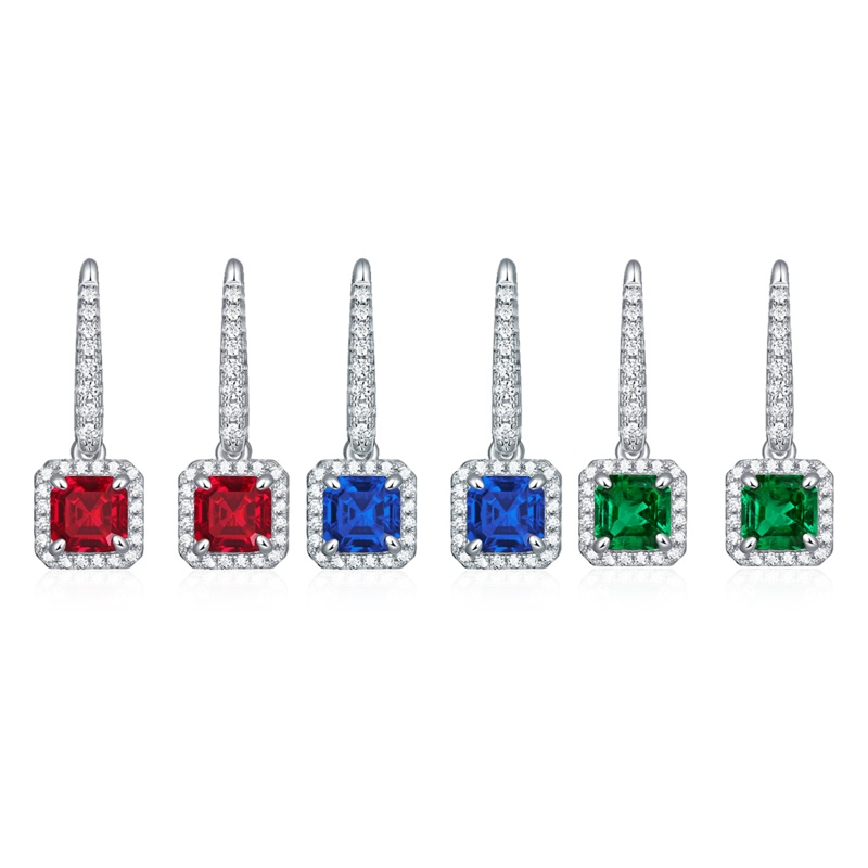 Introducing our stunning 1.0 carat square colored Lab Created Gemstone with halo, S925 silver plated platinum drop earrings, a perfect blend of elegance and modern sophistication. Crafted with meticulous attention to detail, these earrings feature a brilliant square cut lab-created gemstone that captures and reflects light beautifully, making them a captivating addition to any jewelry collection.