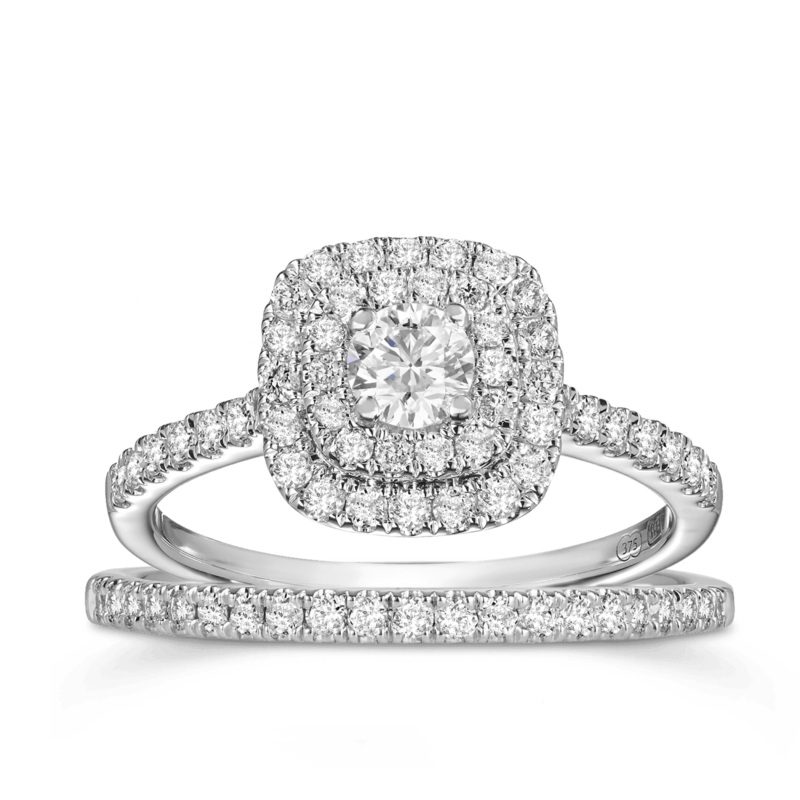 A stunning, sparklingcushio nshape andround brilliant-cutcentre stone diamond, surrounded by a double halo of round brilliant cut diamonds. This engagement ring’s band is made from 9ctwhitegold with the claw setting also made from 9ct white gold.