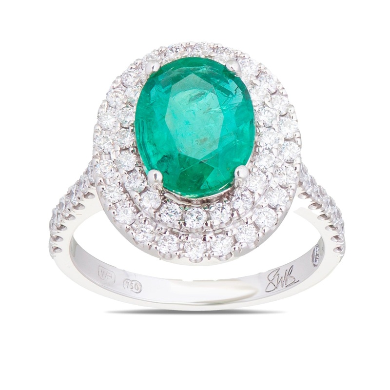 Indulge in opulence with this exquisite Emerald and Diamond Ring from the Stuart Bishop Collection. Crafted in 18ct Yellow and White Gold, this stunning piece is set with a single oval cut emerald at its center and an additional forty-five round brilliant