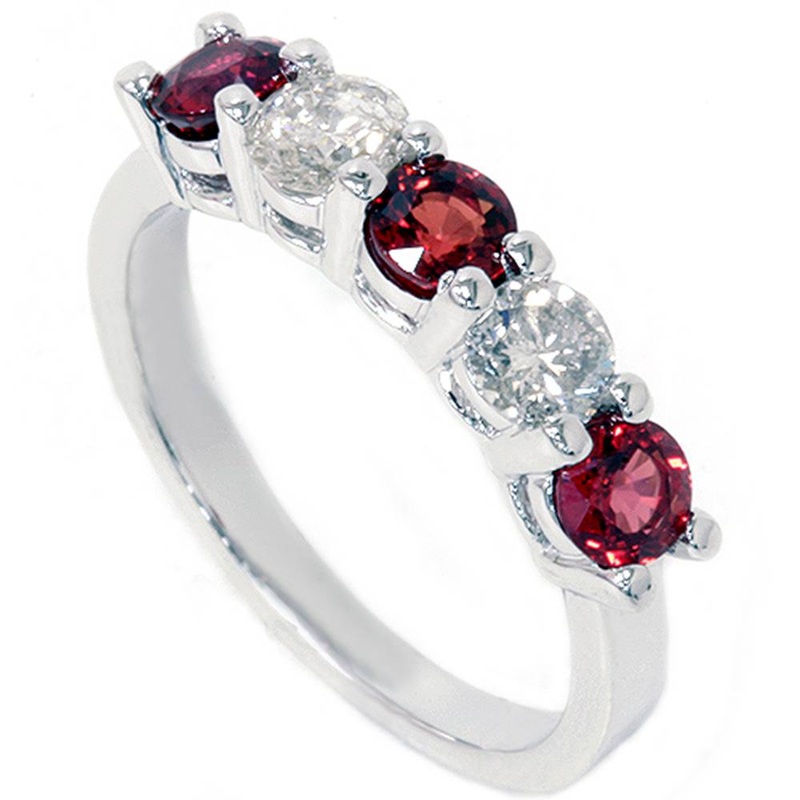 This women's ring features three genuine rubies and two round white diamonds. All stones are set in solid 14k white gold.Item #: WR1003RWidth: 2.5 mmWeight: 3.2 gMetal: 14k White GoldDiamond Cut: RoundDiamond Color: G/HDiamond Clarity: I1-I2Diamond Carat:
