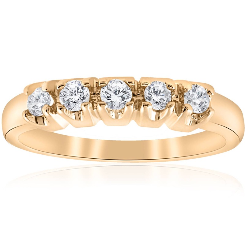 This classic ladies wedding ring features five round brilliant cut natural diamonds. All diamonds are prong set in 14k yellow gold.