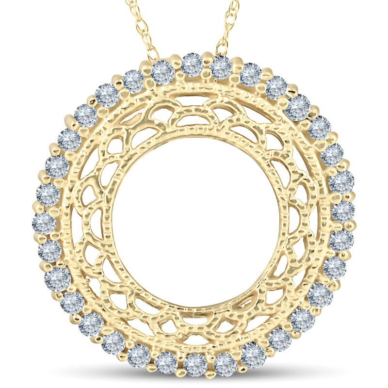 This circle eternity pendant features 32 round brilliant cut natural diamonds. All diamonds are prong set in 14k yellow gold. .55ct total diamond weight. Includes 18″ 14k yellow gold clasp lock chain.