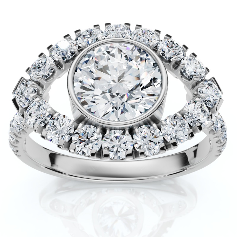 Make a statement with this one-of-a-kind 1 3/4Ct Evil Eye Diamond Ring. This stunning piece features a unique and captivating design, with a brilliant central diamond set in a modern bezel setting, framed by an open oval of dazzling lab-grown diamonds. The