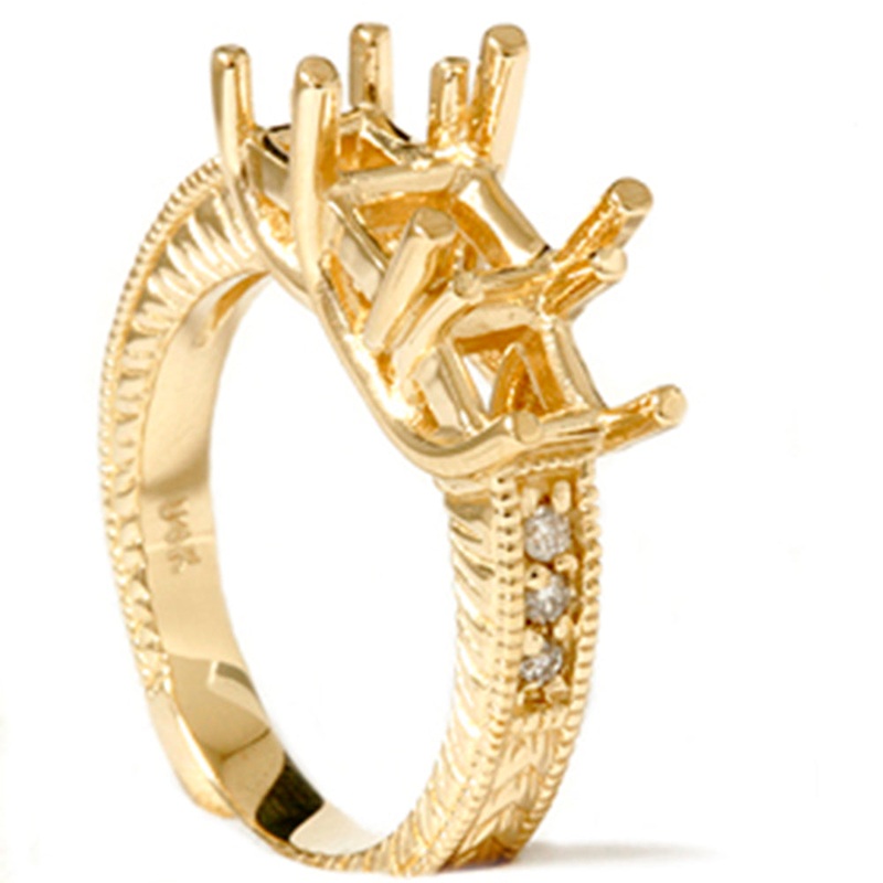 This vintage like hand engraved semi mount features 6 round brilliant cut accent diamonds. All diamonds are pave set in solid 14k yellow gold. The three main stones are available for all combinations. Please specify during checkout.Item #: MGT0116Width: 3