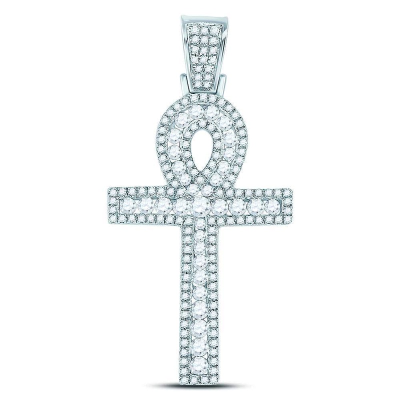 10kt White Gold Mens Round Diamond Ankh Cross Charm Pendant 1 Cttw