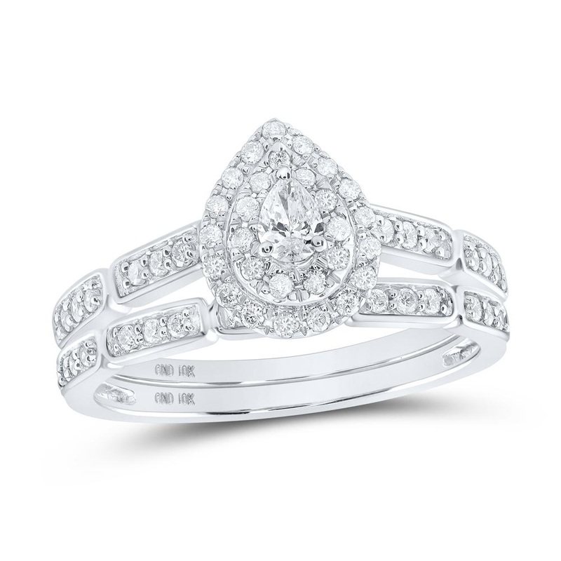 10kt White Gold Pear Diamond Halo Bridal Wedding Ring Band Set 3/8 Cttw