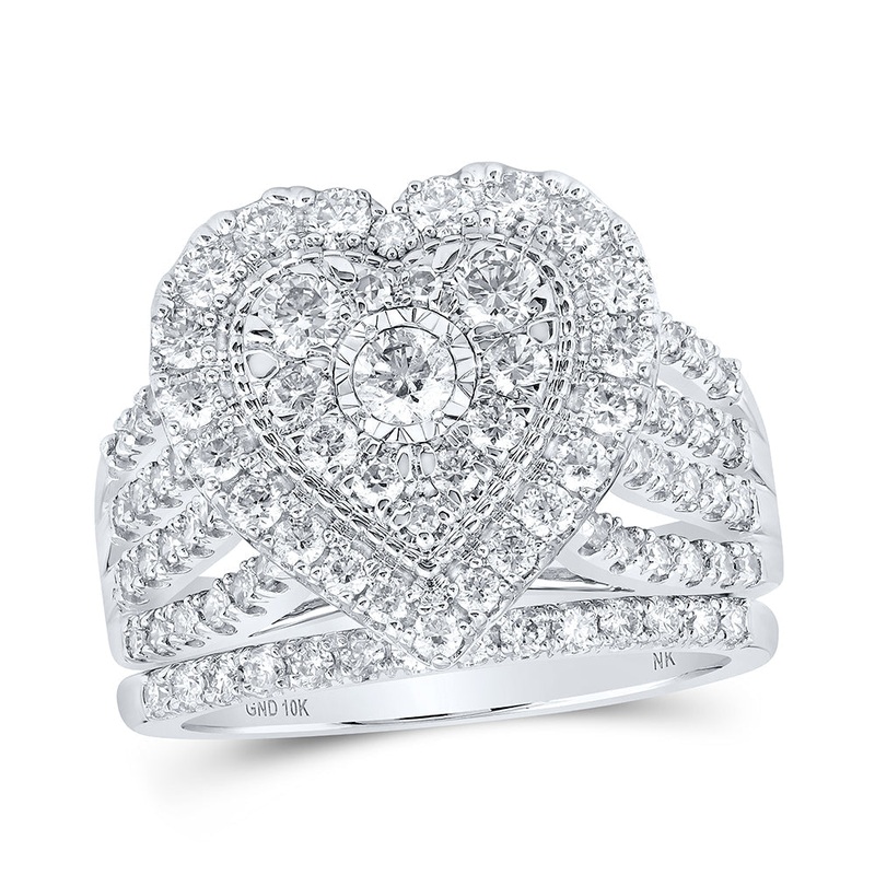 10kt White Gold Round Diamond Heart Bridal Wedding Ring Band Set 1-1/2 Cttw