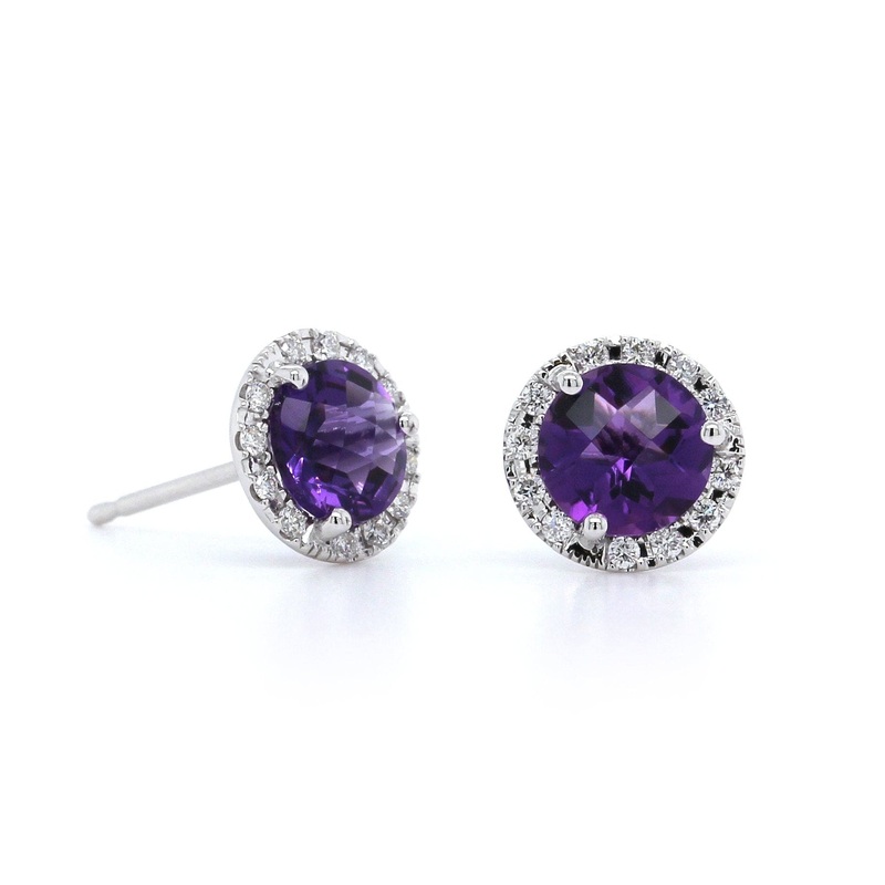 14K White Gold Amethyst with Diamond Halo Stud Earrings