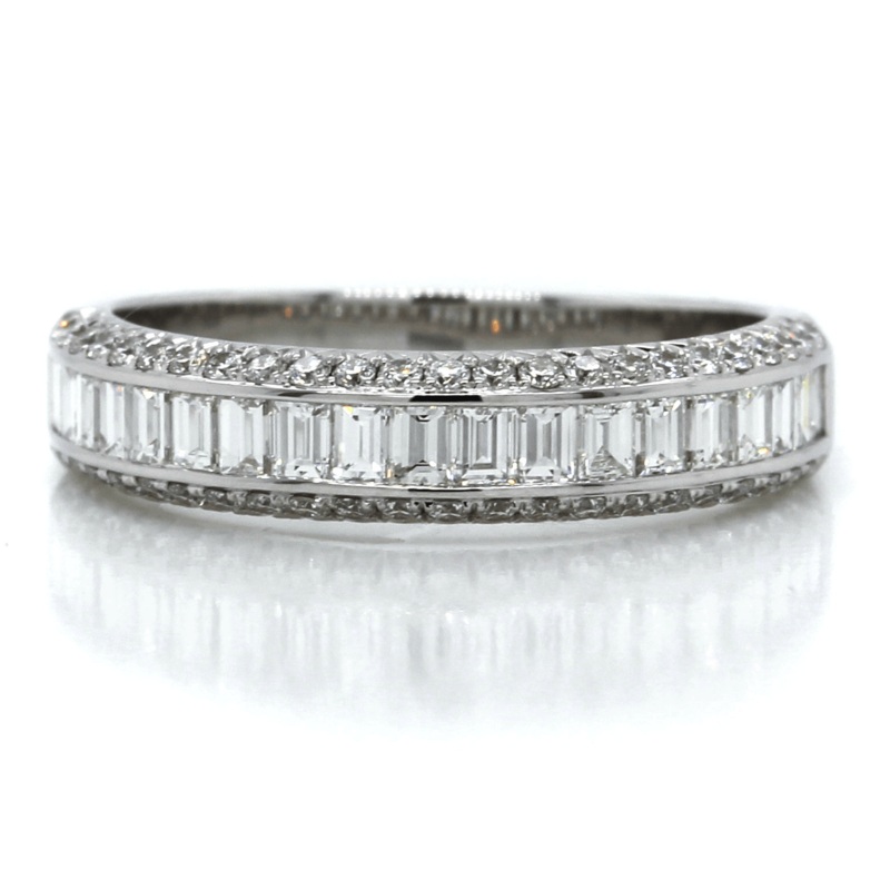 14k white gold 3 row band with channel set center row with baguette diamonds and pave set edges with round diamonds.