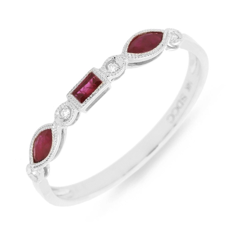 Ruby and diamond stacking band ring set in 14K white gold features marquise and emerald-cut rubies and round diamonds with mill grain details.Ruby: 0.30 carats total weightDiamonds: 0.15 carats total weight. SI clarity.This ring can be worn alone or stacke