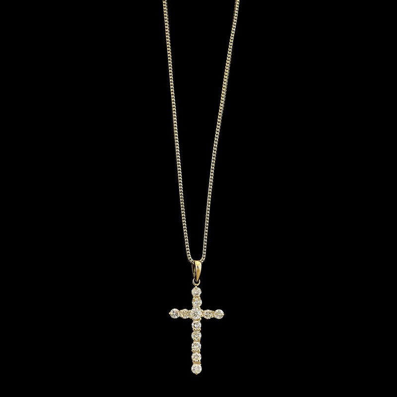14K Yellow Gold Estate Diamond Cross Pendant NecklaceThe pendant is set with 12 full cutdiamondsDiamonds are approx. .90cttw., H-I/SILength 19"