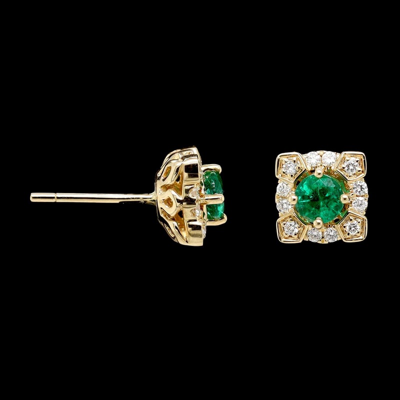 14K Yellow Gold Estate Emerald and Diamond EarringsThe earrings are set with two round cut emeralds, approx. .70cttw.And 24 full cut diamonds, approx. .23cttw, G/VS.