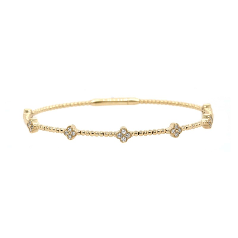 14k yellow gold flexible bracelet with round diamonds and clover stations.