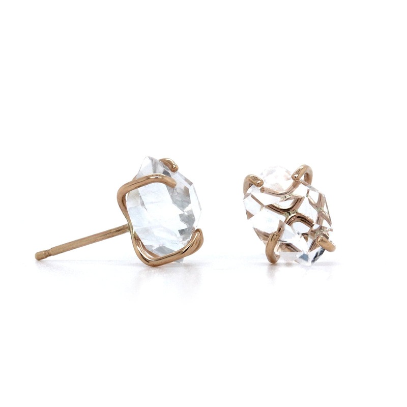 14k yellow gold Herkimer diamond stud earrings, prong set (limited edition) quartz-double terminated creating diamond like chrystals, mined in New York.