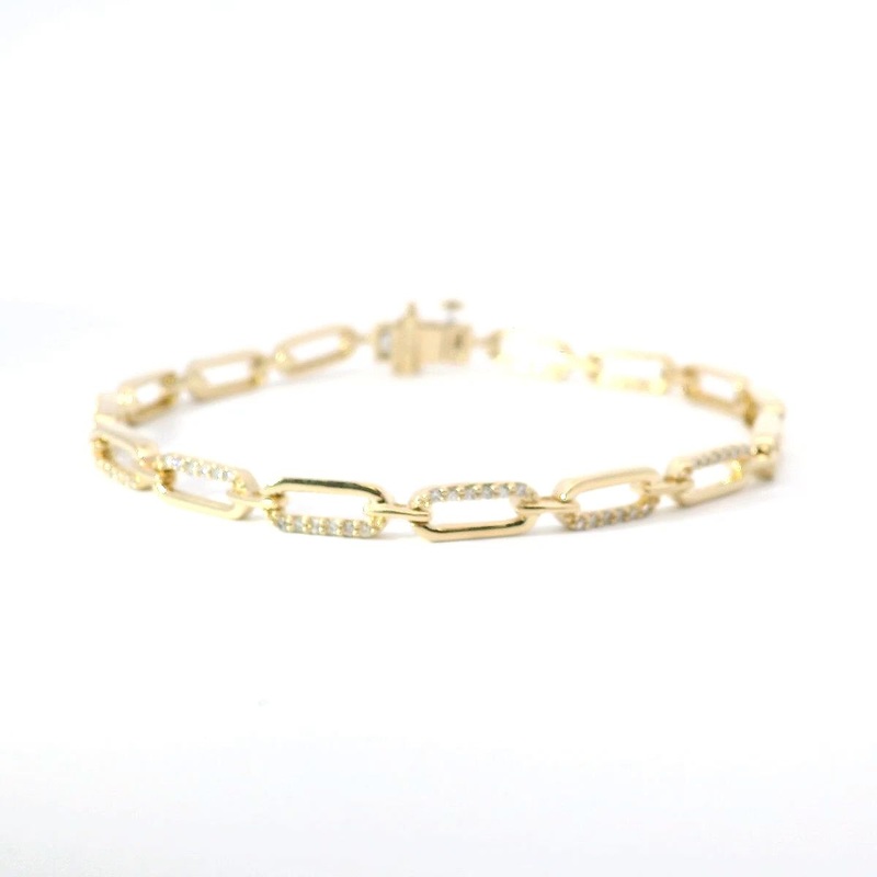 This 7 inch 14K yellow gold and .50CTTW diamond paperclip style tennis bracelet is crafted with natural diamonds of SI2-I1/H-I quality, offering a fashion-forward addition to any jewelry collection. With high-quality materials and a modern design, this bra