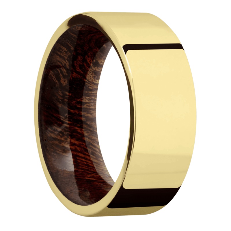 8 mm wide Flat 14K Yellow Gold band featuring a Sapele sleeve.
