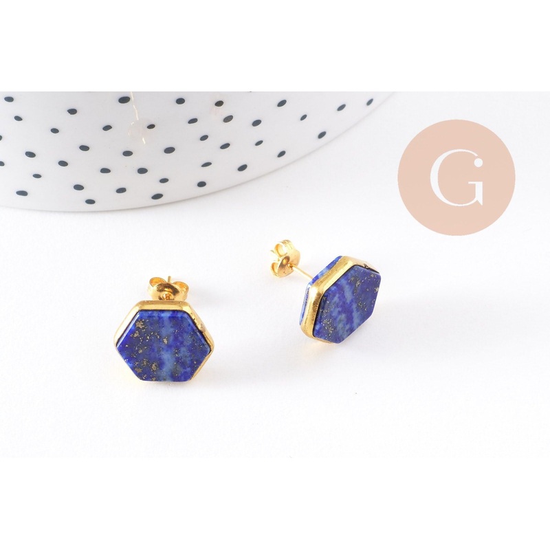 18K gold lapis lazuli stud earrings, gold jewelry, craft supplies, lapis lazuli earrings, natural stone earrings, pair 18K Gold Plated Natural Lapis Lazuli Earrings Sold in pairs Gold-plated steel pusher Delivered in their gift box Length: 14mm Width: 13mm