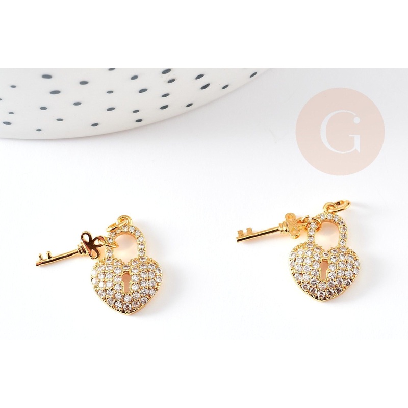 To make magnificent necklaces, earrings and bracelets, adopt this cute padlock, small love pendant with its key and lucky charm in golden brass, decorated with small shiny white zircons.