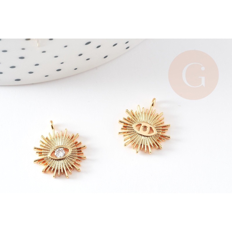 18k gold-plated brass sun pendant zircon, crystal pendant for creating lucky charm jewelry for women in zircon, 17mm, unit To make magnificent necklaces, earrings and bracelets, adopt this small sun lucky charm pendant in gold-plated brass, decorated with