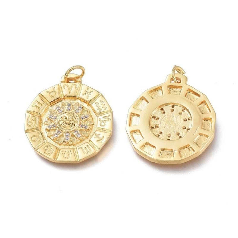 18K gold zodiac sun pendant and zircons, gold horoscope pendant, lucky charm, gold brass, Sun pendant, 21mm, each A golden sun pendant medal decorated with zodiac houses on the edge and white zircons. Lovely for creating a pair of earrings or a fine neckla
