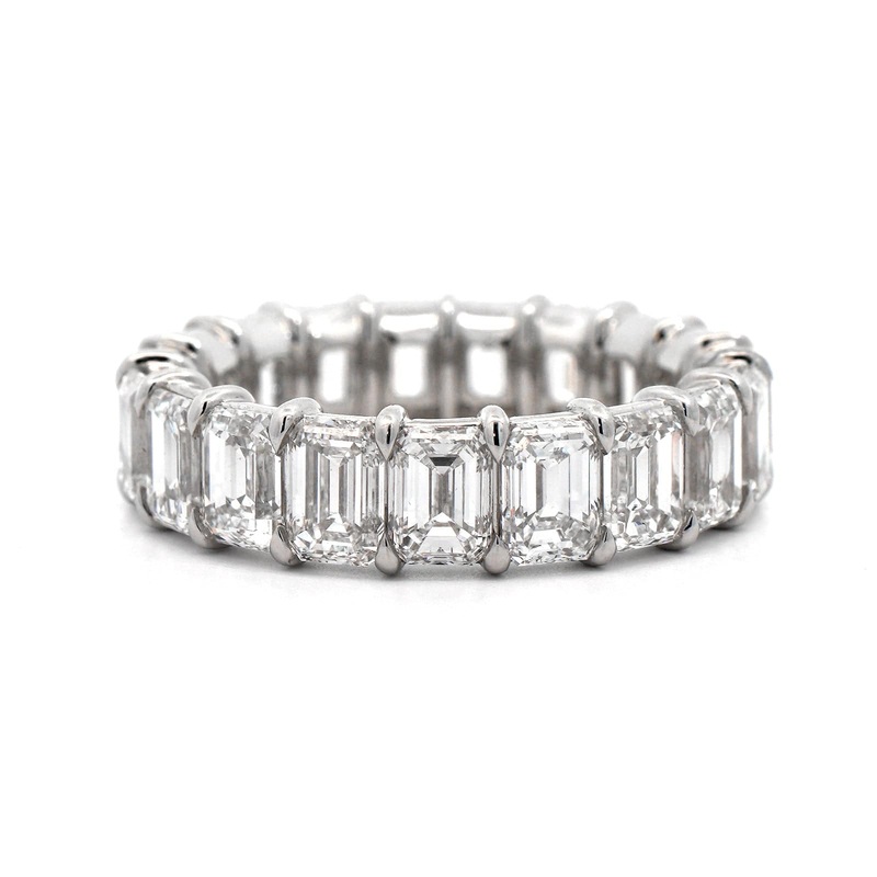 18k white gold eternity band with emerald cut diamonds.