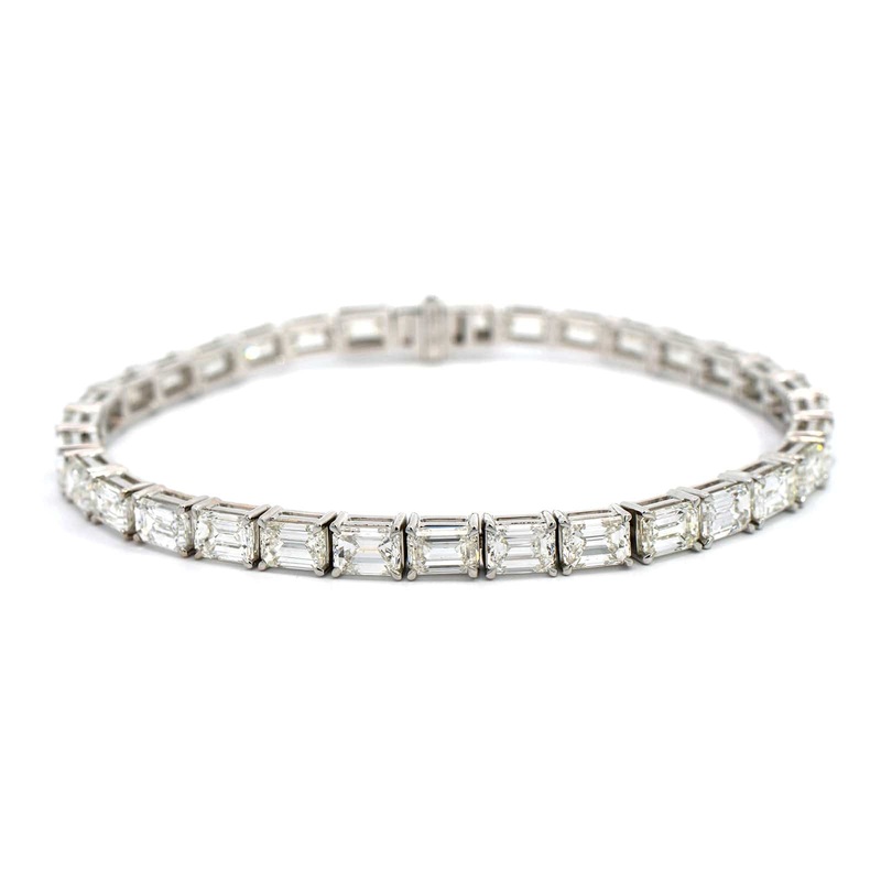 18k white gold tennis bracelet featuring emerald cut diamonds set east to west.