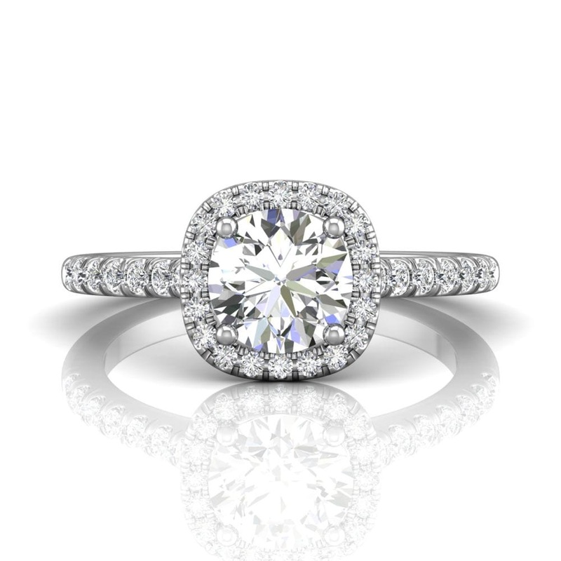 Martin Flyer Flyerfit Cut Down engagement ring in 18k white gold with a GIA certified round cut diamond center stone and diamond halo.