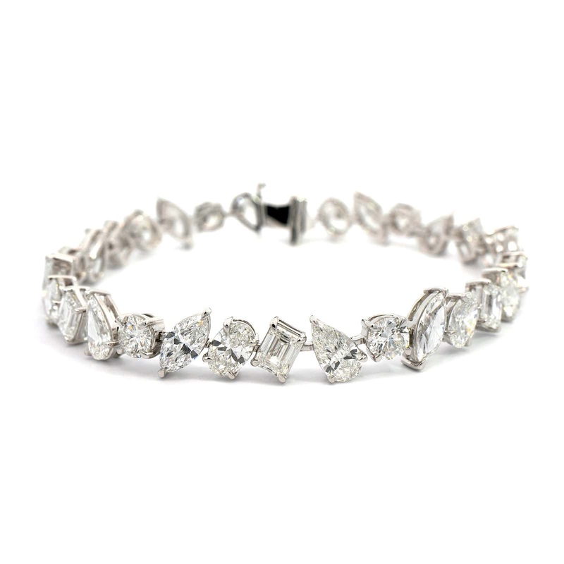 18k white gold line bracelet featuring emerald, pear, oval, and marquise cut diamonds.