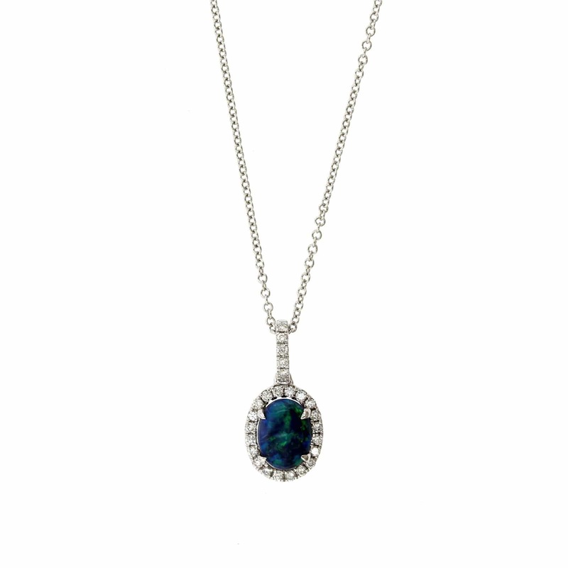 Be the first to review “18K White Gold Oval Black Opal and Diamond Pendant”