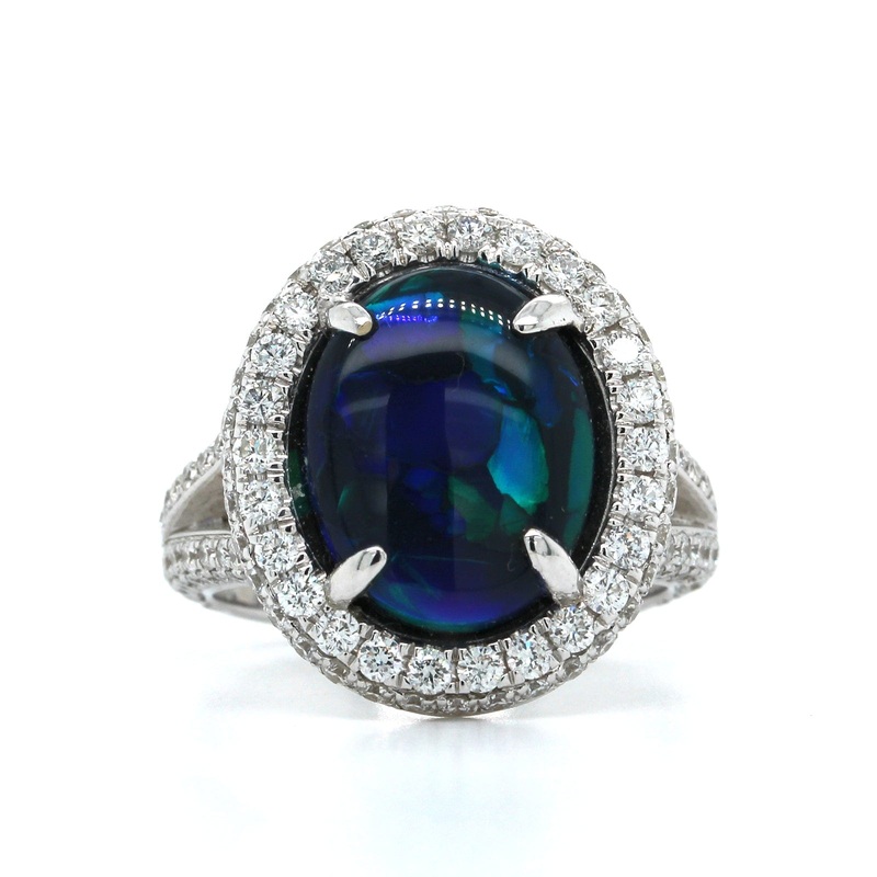 18k white gold ring featuring a lightning ridge opal with a diamond halo and a pave split shank.