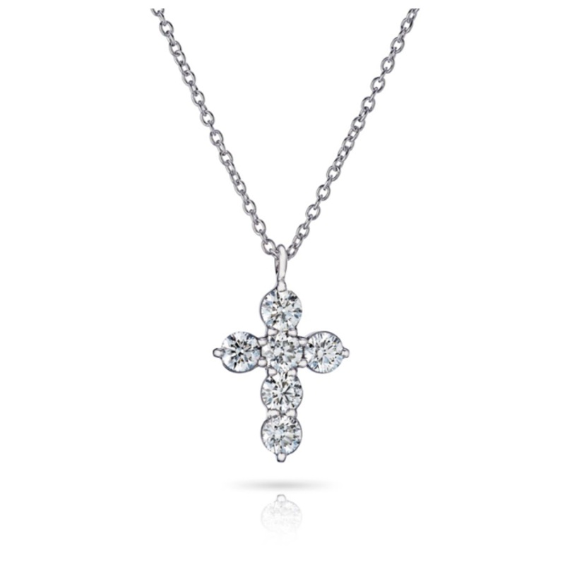 This 18 karat white gold Brent Miller Signature diamond cross pendant features (6) round brilliant cut diamonds with a combined total weight of approximately 1.50 carats and quality characteristics of G/H color, SI1 clarity, and Excellent cut. Necklace is adjustable up to 22 inches and is finished on a cable chain with a lobster clasp.