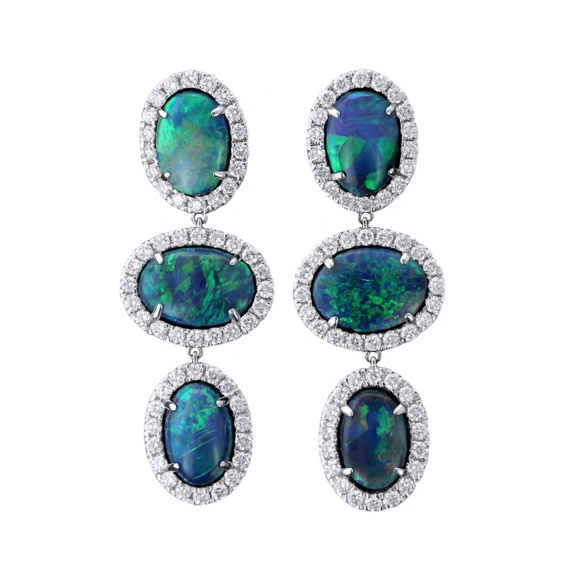 18K White Gold Triple Opal Diamond Halo Drop Earrings
