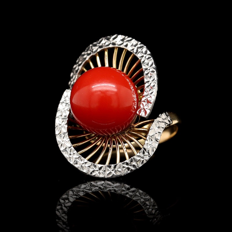 - The ring is set with one round coral measuring 12.10mm.
