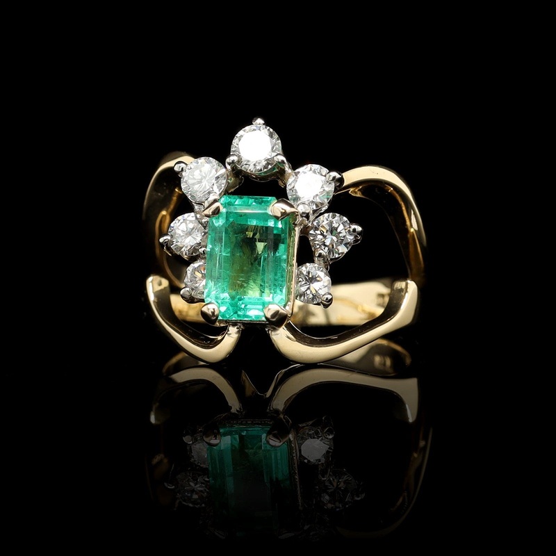- 18K Yellow Gold Estate Emerald and Diamond Ring