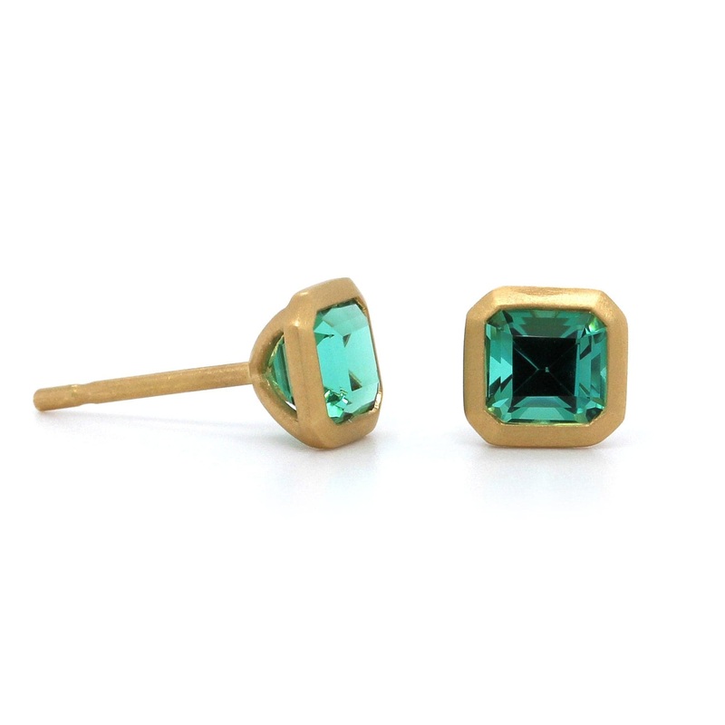 18k yellow gold emerald shaped bezel set green tourmaline stud earrings 6.40×6.25mm approx 1.32ct.