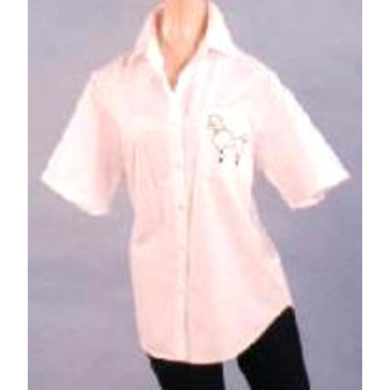 A18056Includes: Cotton, button-up blouse with embroidered poodle on chest.Colors: Black, Pink, Red, White.Size: S (6-8), M (8-10),L (12-14), XL (16-18)