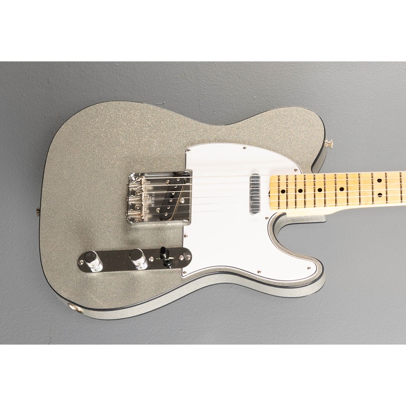 Silver Sparkle with the matching headstock, Double bound Alder body, Mid 60s Oval C shaped Maple neck with a 9.5 radius Maple cap fingerboard and medium jumbo frets, 25.5" scale length, 1.650" nut width, Handwound 1963 NOS Tele bridge and neck pickups, 3-w