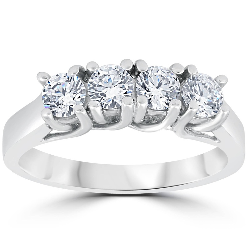 This classic women’s anniversary wedding ring features 4 round brilliant cut natural diamonds, never enhanced. All diamonds are prong set in 14k white gold. 1.00ct total diamond weight.