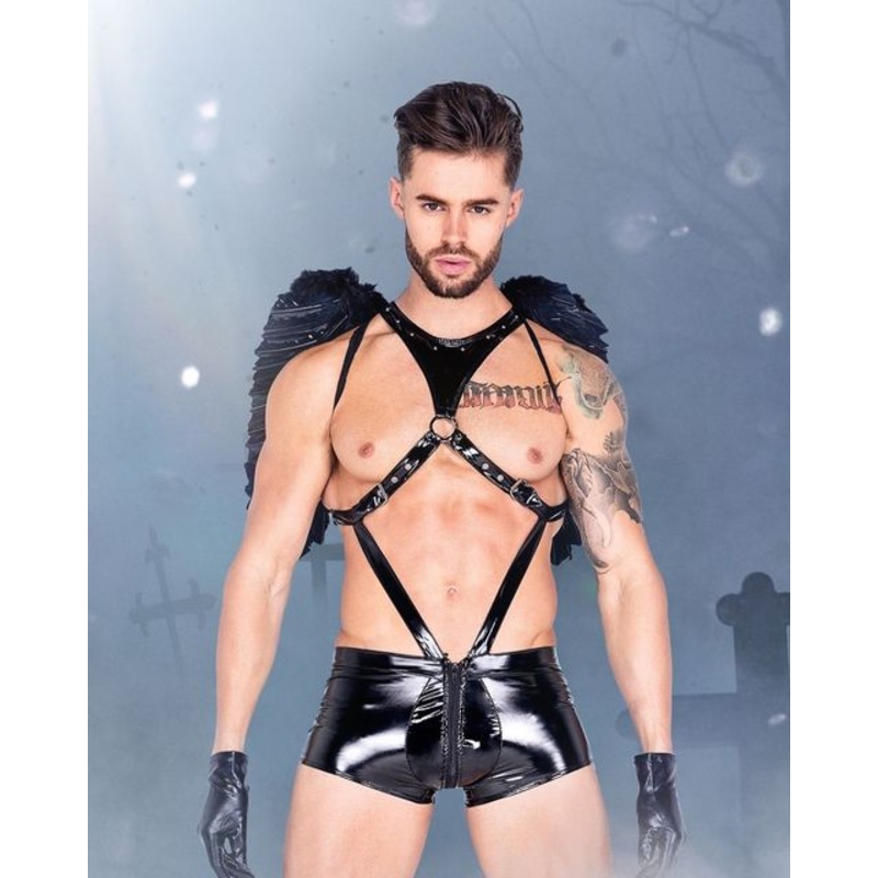 This isnt your regular old angel costume! This outfit turns up the heat on a classic costume with sexy touches that are a departure from the ordinary. They wont be able to keep their hand off of you when they see this wet-look vinyl ensemble. Show off that body in a black singlet thats not for your run-of-the-mill wrestling match! This one piece features short short bottoms that show off your legs and buns, and a criss-crossing top with buckles and studs that accentuate your chest. Have them confessing all their dirtiest desires when you arrive on the scene in a look that will have you feeling like the king of darkness himself!