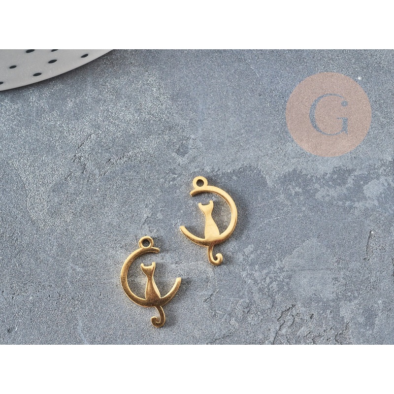 A lovely little pendant in the shape of a cat sitting on a crescent moon , made from 201 stainless steel. Length: 17.5mm Width: 11mm Thickness: 1mm hole:1.5mm Sold individually 201 gold stainless steel, hypoallergenic, nickel-free Other gold-plated steel f
