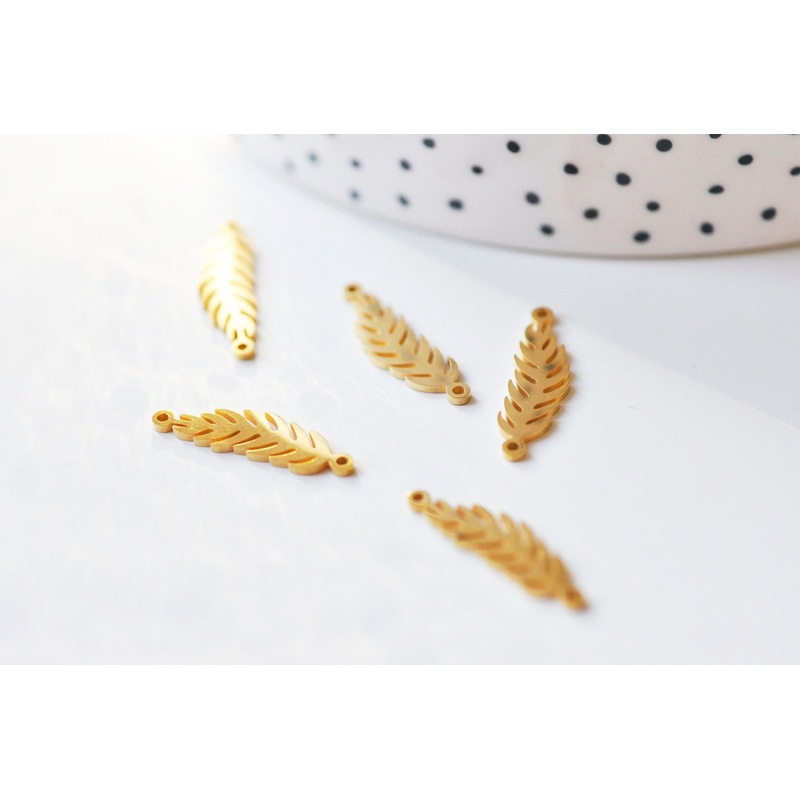 Gold stainless steel feather connector pendant, for your DIY jewelry creations Length: 6.5mm Width: 22mm Thickness: 1mm Hole:1.2mm sold individually 201 Steel Hypoallergenic, no nickel release, Quality sprayed gilding, long lasting Other gold-plated steel