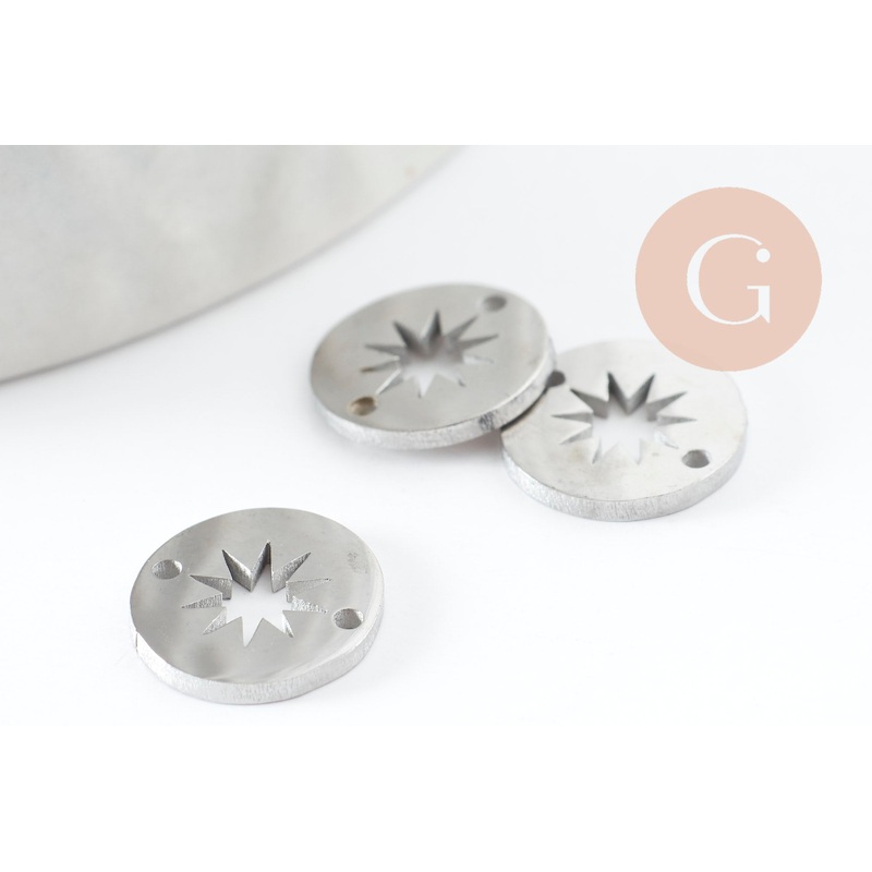 Bring a touch of modernity and light to your creations with this round connector pendant in 304 stainless steel with platinum finish. With a finely cut design representing a hollowed-out sun and a diameter of 10 mm, this connector is perfect for creating e