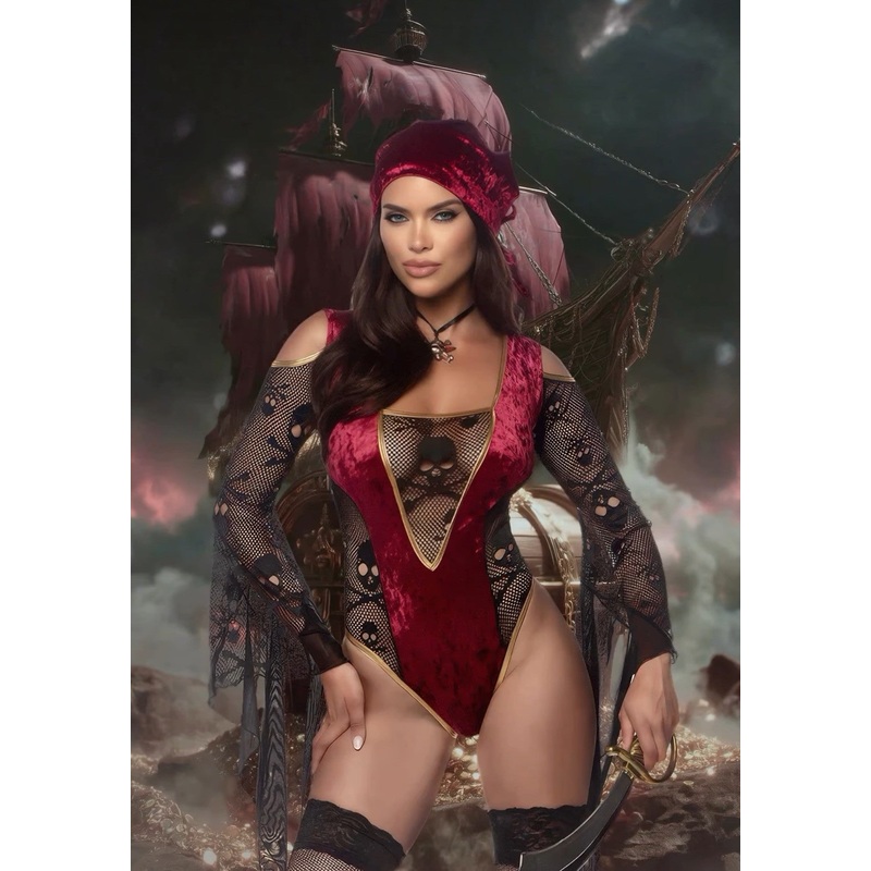 Crafted from soft, stretchy knit fabric, the romper hugs your curves while providing comfort and flexibility for all-night dancing. The matching head scarf adds authentic pirate flair, completing your bold, adventurous look. The included toy sword is perfect for teasing and playful role-play, making this set ideal for costume events, themed parties, or cosplay.