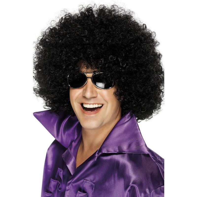 Mens 1970s Huge Afro Fancy Dress Wig This is the ultimate in 1970s inspired wigs and is sure to make a huge statement at any fancy dress party. The massive wig is made from synthetic black hair styled into an enormous afro, it is available in one size whic
