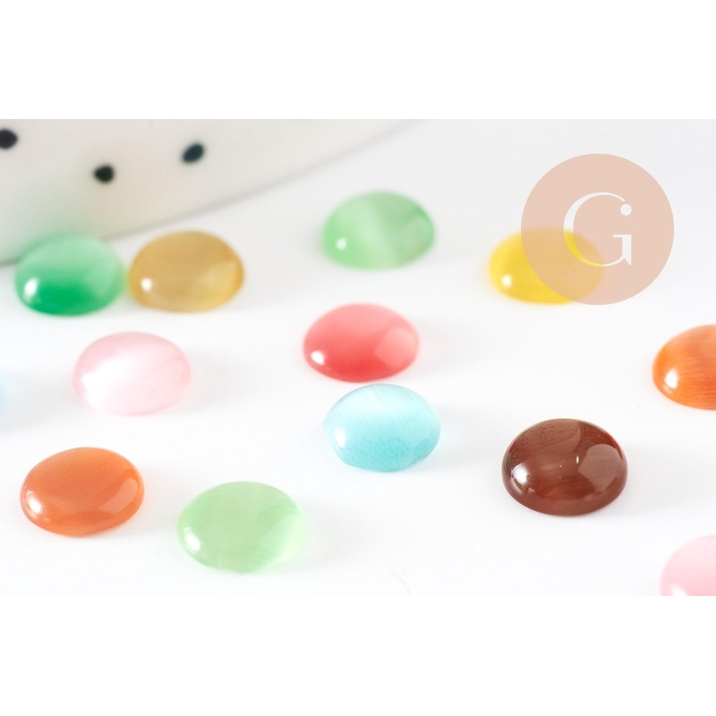 Fall for these 7mm round multicolored cat's eye glass cabochons You can place it on your rings, earrings and necklaces, as well as bracelets and cuffs. To stick on a suitable support Dimensions: 7mm Thickness: 2mm Sold in packs of 20 Mixed colors Other cab